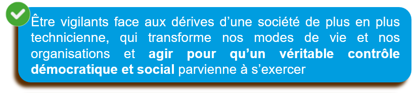 - Favoriser une réflexion éthique sur l’innovation, pour préserver l’humain et résister aux dérives d’une société de plus en plus technicienne et déshumanisée